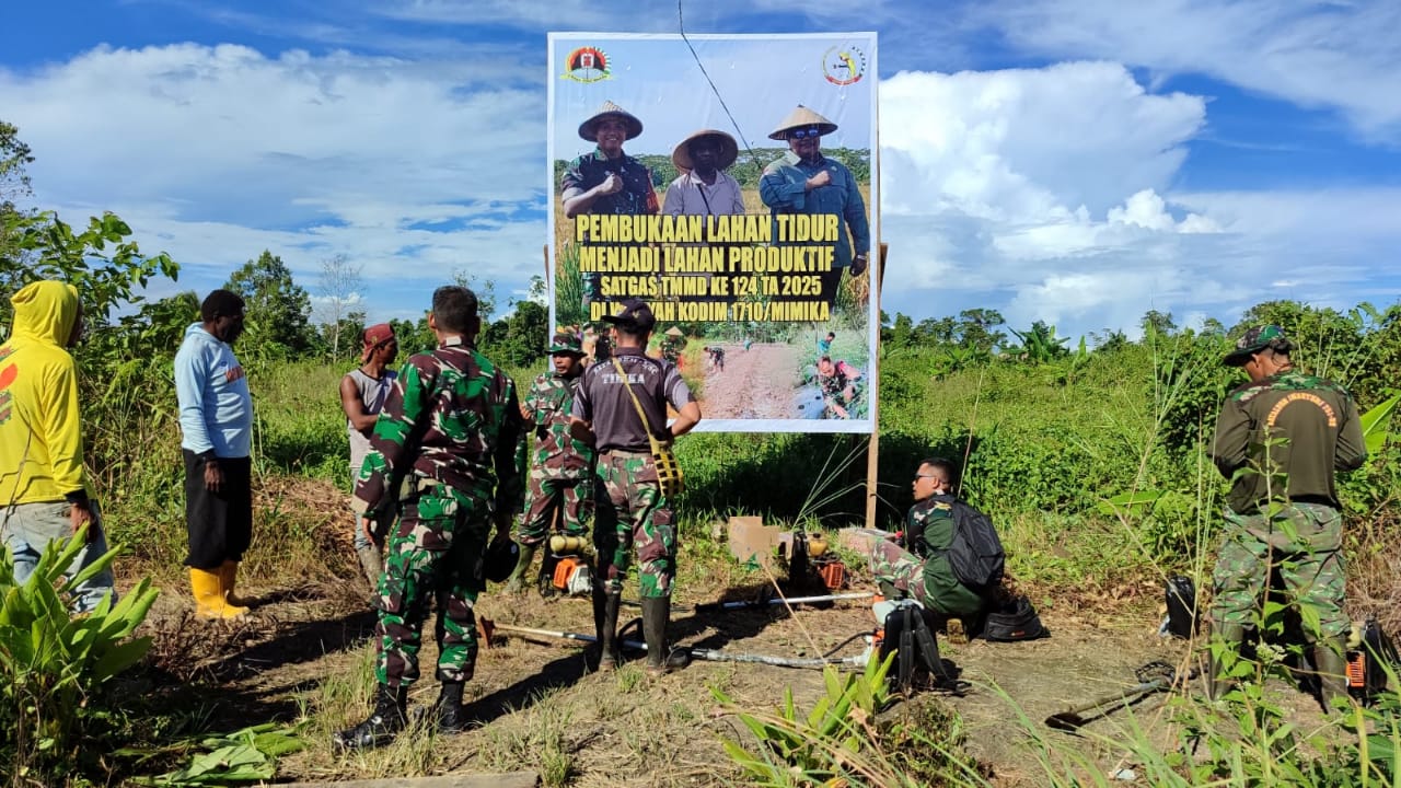 Satuan Tugas TNI Manunggal Membangun Desa (TMMD) ke-124 Kodim 1710/Mimika memperluas jangkauan kegiatan dengan membuka lahan tidur menjadi lahan produktif untuk Program Ketahanan Pangan (Hanpangan), di Kampung Naena Muktipura, Distrik Iwaka, Kab. Mimika. Rabu (07/05/2025). TMMD tahun ini selain kegiatan fisik seperti pembuatan rumah, MCK umum dan sumur bor, juga melakukan pembukaan lahan tidur untuk mendukung Hanpangan seluas 2,5 hektar.