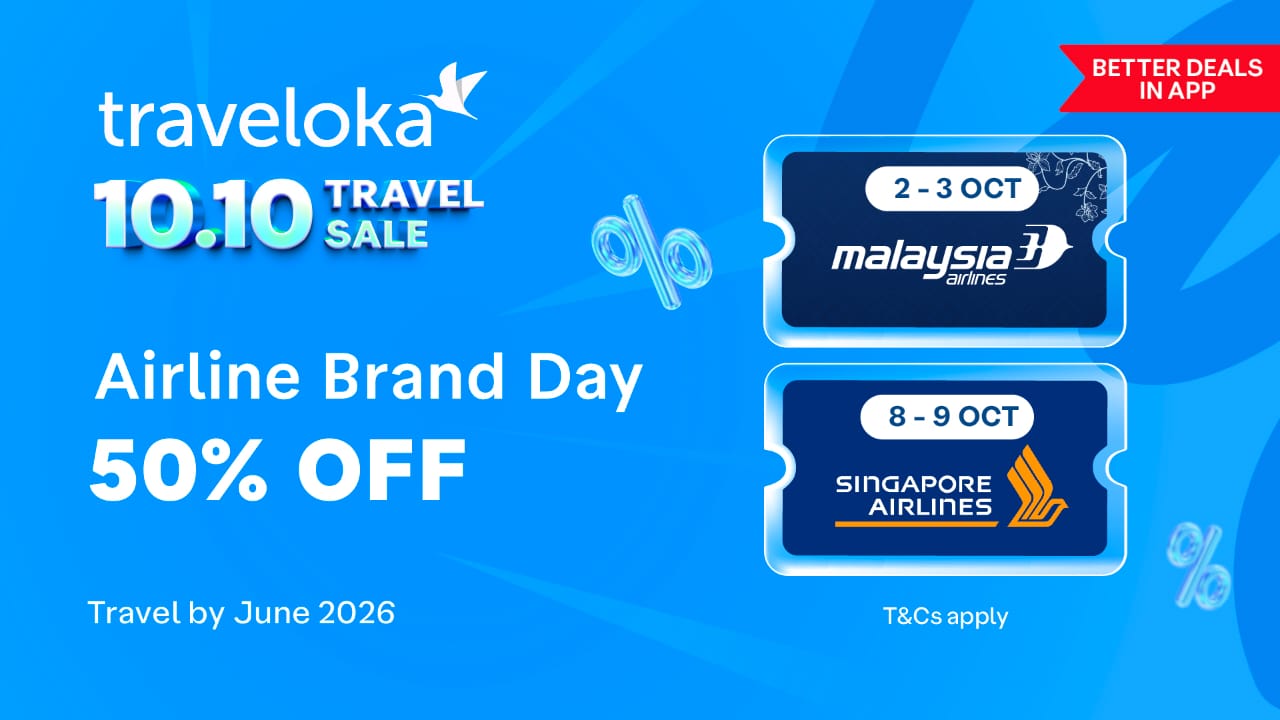Penawaran Terbaik untuk Setiap Perjalanan Seluruh destinasi ini dapat dinikmati dengan harga spesial melalui Airlines Brand Days dan Traveloka 10.10 Travel Sale. Promo eksklusif tersedia dengan diskon 505 untuk penerbangan pilihan Garuda Indonesia (1-2 Oktober), Malaysia Airlines (6-7 Oktober), dan Singapore Airlines (8-9 Oktober). Selain itu, tersedia flash sale harian hingga Rp10 juta, kupon diskon hingga Rp500 ribu untuk pengguna baru, serta friple points bagi anggota Traveloka Pnionity. Tunggu apa lagi? Unduh atau perbarui aplikasi Traveloka sekarang dan bersiaplah menemukan penawaran terbaik selama Airlines Brand Days untuk mewujudkan perjalanan impian Anda.